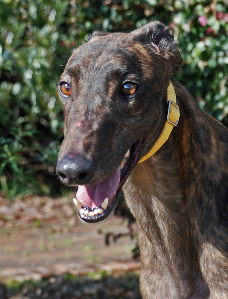 Sweet Pete just arrived from the Birmingham AL Race Course Track adoption kennel. He never actually raced there, but was one that was sent there because they transport a lot of retired dogs to other adoption groups across the country, including ours. He raced 126 races all at the Palm Beach Race Track in Florida. He was a pretty good racer racing a lot of his career at the top A level and even winning A level races. Sweet Pete is a stunning 76lb dark brindle guy that is a rich mahogany red with black stripes. He has the most beautiful shiny coat. Just stunning! Sweet Pete turned 4 on December 8th. He is a strong guy that needs some reminders on walking nicely on leash because he gets excited and wants to see everything at once. He is very friendly and has loved all the people he has met. Sweet Pete just couldn't resist chasing the cat, so he needs a home with no kitties. He was better with the little dog he met and just sniffed him politely but was initially interested in him at a distance before he knew what he was. He just needs a careful intro to small dogs that might look like bunnies or squirrels. Sweet Pete's sire is the famous Gable Sour Cream and his dam is AMF Blazing Sun. Pete is being fostered with a 6 year old child and really seems to enjoy being around her. We listed him as "older kids only" because he could knock over a toddler accidentally when he was being bouncy, happy and silly. Pete is more energetic and fun than the typical couch potato greyhound. He would be the perfect choice for a family that likes to go for walks or hikes. Sweet Pete will enjoy a more active lifestyle than most. Pete does complain about being in his kennel, so would not be a good choice for apartment or townhouse living.