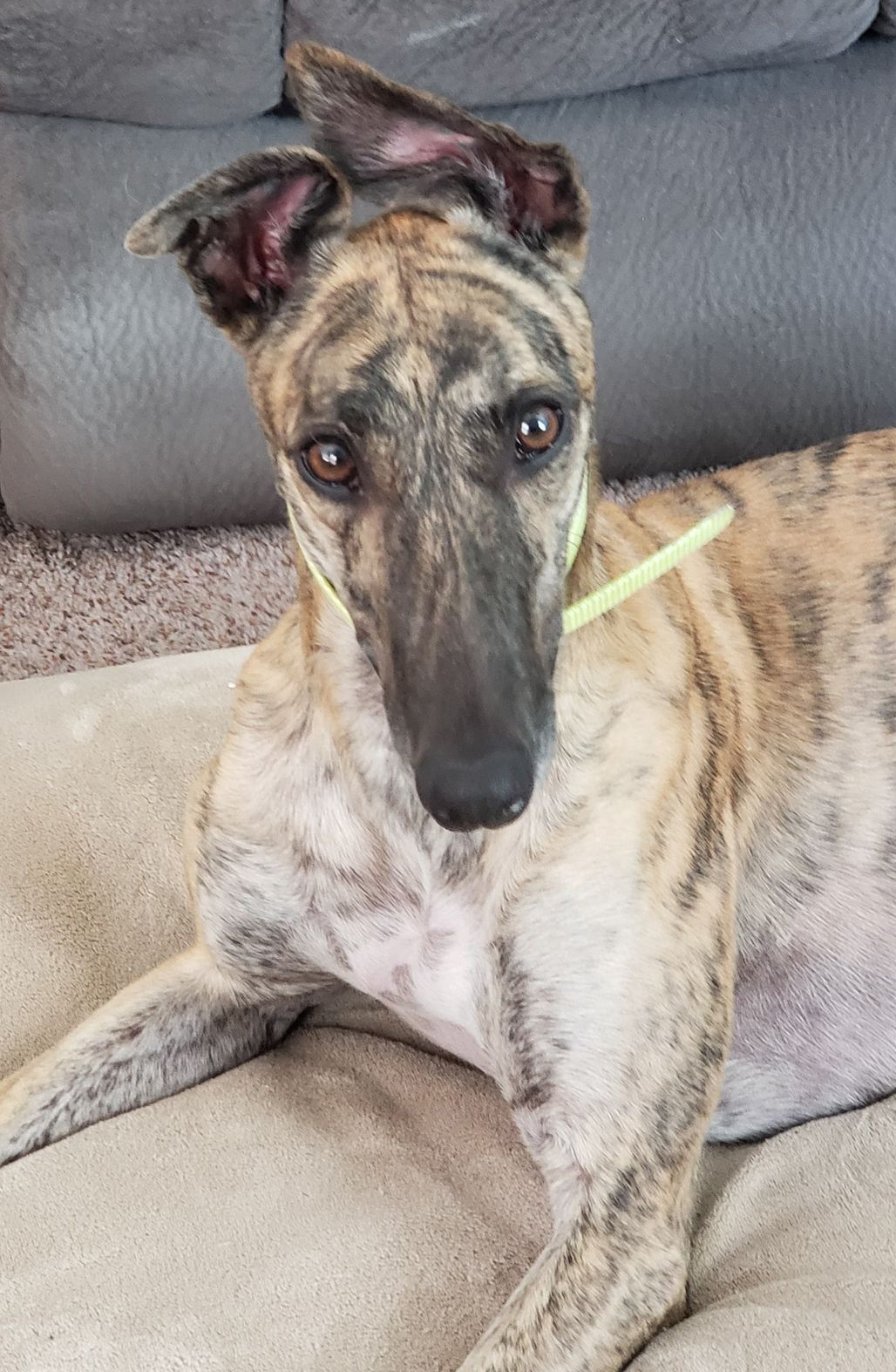 Tic Toc is arriving soon from the Bolton Kennel at the Sanford Orlando Race Track. The track closed suddenly due to the Corona Virus. Tic Toc was just starting out her career and had only raced 18 races. She just won 2 of those. She is a young girl that won't turn 2 until July 16th. She is brindle and raced at 64lbs. Her sire is SE Tali Sundance. Her mom is also up for adoption currently, AMF Ex Hunter. Tic Toc passed her cat test at the track so should be fine to live with cats or small dogs. Since her mom has the eye condition pannus, that can be hereditary, it is possible that Tic Toc will need daily eye drops to prevent her from losing her sight. Our vets will check her when she arrives for any sign of the eye condition. More as we get to know her.