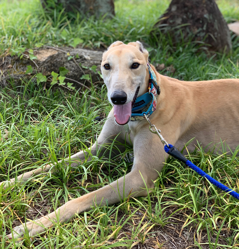 Special Needs! Tad came in from the Blanchard Kennels at Orange Park Race Track in Jacksonville FL. She didn't actually race there though. She actually raced at Blanchard Kennels at Wheeling Downs in WV first, then was moved to their kennel at Tri-State in WV. Tad raced 103 races and did get up to the top AA level at Tr-State so was a good racer. She just turned 4 on May 25th and raced at 61lbs. Her sire is NMS Sweet Thing and her dam is Boc's Posh Spice. Tad was a little shy and overwhelmed when she arrived but does warm up pretty fast and loves her people deeply. She passed her cat test with just some sniffing and would back away from the cat when it approached and rubbed on her. She lived in a home with a cat and was afraid of it. Tad came in with a note attached to her paperwork from her trainer: "Tad is very special, she's a little strange but awesome". Tad is special needs because she has pretty severe separation anxiety. She needs to be crated when left to keep her from being destructive and going potty in the house, but she is very loud in the crate and hates it. Since she is loud in the crate she definitely couldn't live in a townhouse or apartment. She needs to have blankets as padding in her crate rather than a dog bed, because she likes to unstuff dog beds when left alone. Although she passed her small dog test, she can be bossy with other dogs small and large so may do better as an only dog. Having another dog in the home to hang out with when left doesn't seem to help her separation anxiety. Tad has been returned a couple of times now due to her separation anxiety. She is looking for a quiet home that has people home most of the time that can spend time working with her and help her get over her separation anxiety. She can have tummy issues, but since retirement has been on a lamb based food. She has also been able to eat fish treats, beef, pasta, and milkbones. She was fed a mostly beef diet at the track. Tad has been living in a home without a fenced yard and does potty well on leash. She loves to run and play at the dog park, so would do great in a home with a fenced yard too. She loves to go for car rides and will jump right in the car on her own. She loves kids and seems drawn to them, but since she can be bossy with other dogs, we would prefer to place her in a home with no small kids.