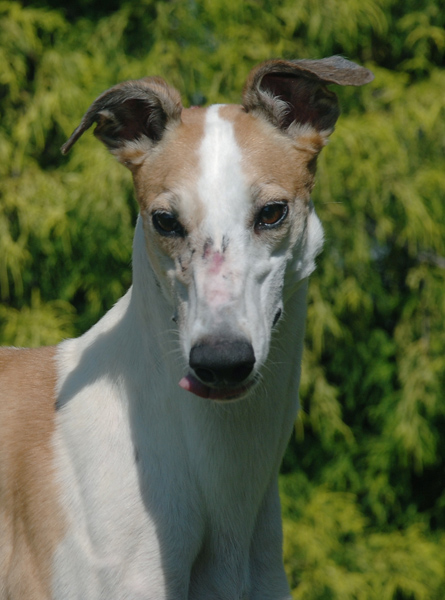 Free Bee just arrived from the Blanchard Kennel at Orange Park in Jacksonville Florida. She is a pretty tall girl for just 60lbs. She raced 142 races and was pretty good, racing at Dubuque and Bluffs Run in IA and Southland in Arkansas and Naples Ft Myers in Florida before moving to Orange Park. She was mostly a B level racer but did compete in a top level stakes race. Although she turned 4 on April 9th, Free Bee still has a cute puppy look to her. She is VERY outgoing and gives hugs and just loves people. She loves playing with other dogs and especially loves balls that squeak and toys that squeak. She can be energetic for short spurts but calms down really well in the house and just wants to put her head in your lap and be close. Free Bee's sire is the famous Kiowa Mon Manny and her dam is Boc's Mc Raisen. She has been in a foster home with a calm older yorkie and has been fine with him. She loves playing with all the other greyhounds at a playgroup. We were told that she is a pretty confident girl and can be a little bossy at times. She seems like she is going to be a fun girl for a family that wants a playful, silly, girl. She does potty well on leash and is leash walked at her foster home but she would probably do best with a fenced yard where she can chase balls and run and play since she enjoys that so much. Although she has been living with cats at her foster home they are having to keep her away from them because she is too interested in the to be comfortable with so she needs a home with no cats. Her foster home says she is the most loving dog they have had, even more loving than their personal greyhound. She is super sweet!