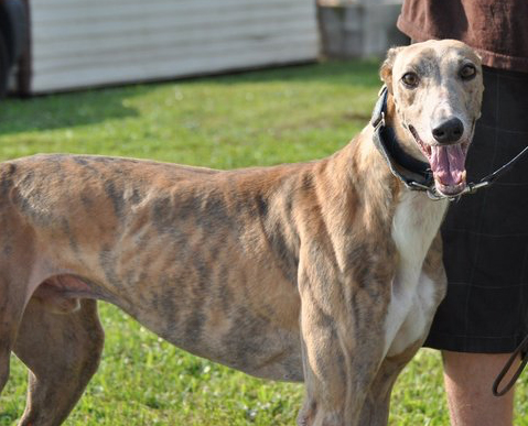 Bentley raced a 181 races at Orange Park in Florida and won 32 of those races. He was a very good racer that raced at the top A level for most of his career. He competed in Stakes races for the best dogs at the track. He raced at 68lbs and turned 8 on May 28th. Bentley's sire is Oya Tom Terrific and his dam is GS Flame. Bentley has been in an adoptive home for some time now but he was re-homed by one of his owners due to a divorce. The adoption group that placed him initially has asked if we could re-home him for them. Bentley was checked by our vet, is healthy and received a fresh dental. His vaccines are all up to date and he has obviously had great care by his previous family. Bentley is a very sweet boy that is friendly and happy. He was around small kids from 2 to 10 at the race kennel so is used to being around them. He loves the kids in his foster home now. Bentley has lived with cats and is fine with small dogs. He is already home acclimated and ready to meet his new family. Bentley is sweet and silly and playful and has no idea that he is 8 years old. He is a great snuggler and wants to be in your lap or at least have some part of his body on you. He is very very loving. He has had no accidents in his foster home and is exceptionally well behaved. He is fine when left out of the crate unsupervised and doesn't get into anything. This is a great guy and so handsome.