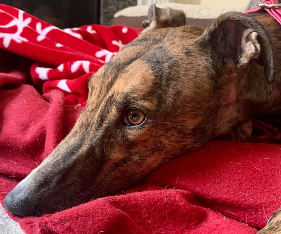 Goldie just arrived from the Birmingham Race Course's adoption kennel. She didn't actually race there but was sent there to be adopted out after the Palm Beach Race Track Closed. Goldie raced only 10 races in Palm Beach. She only won one of those and mainly finished toward the back of the pack. Her last race was June 8th. Goldie is a tiny girl that raced at just 57lbs. She just turned 2 on June 28th. Her sire is the famous TNT Star Wars and her dam is Flyin Gold Ingot. Goldie can be a little timid at first in new situations and a little jumpy with loud noises. She did fine with the kids she met. She met cats and small dogs and seems to be trainable with supervision at first.