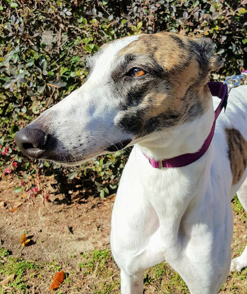 Rosetta Just arrived from the Orange Park Race Track in Jacksonville FL. She raced 90 races at 61lbs. She was not a great racer, mainly competing at the lower levels of racing. Rosetta's last race was Nov 25th and she had been waiting at the track since then for an adopter or a group to take her. She turned 3 on June 6th and is a mostly white girl with just a little brindle on her face and tail and some freckles in her fur. A very pretty girl. Rosetta's sire is PB's Blaze On and her dam is GS Addison. Rosetta did pass her cat test at the track so should be fine to live in a home with cats or small dogs. Rosetta likes kids and is a fun girl that likes to play and run around with her toys in the backyard. She is going to be a fun girl for some lucky family.
