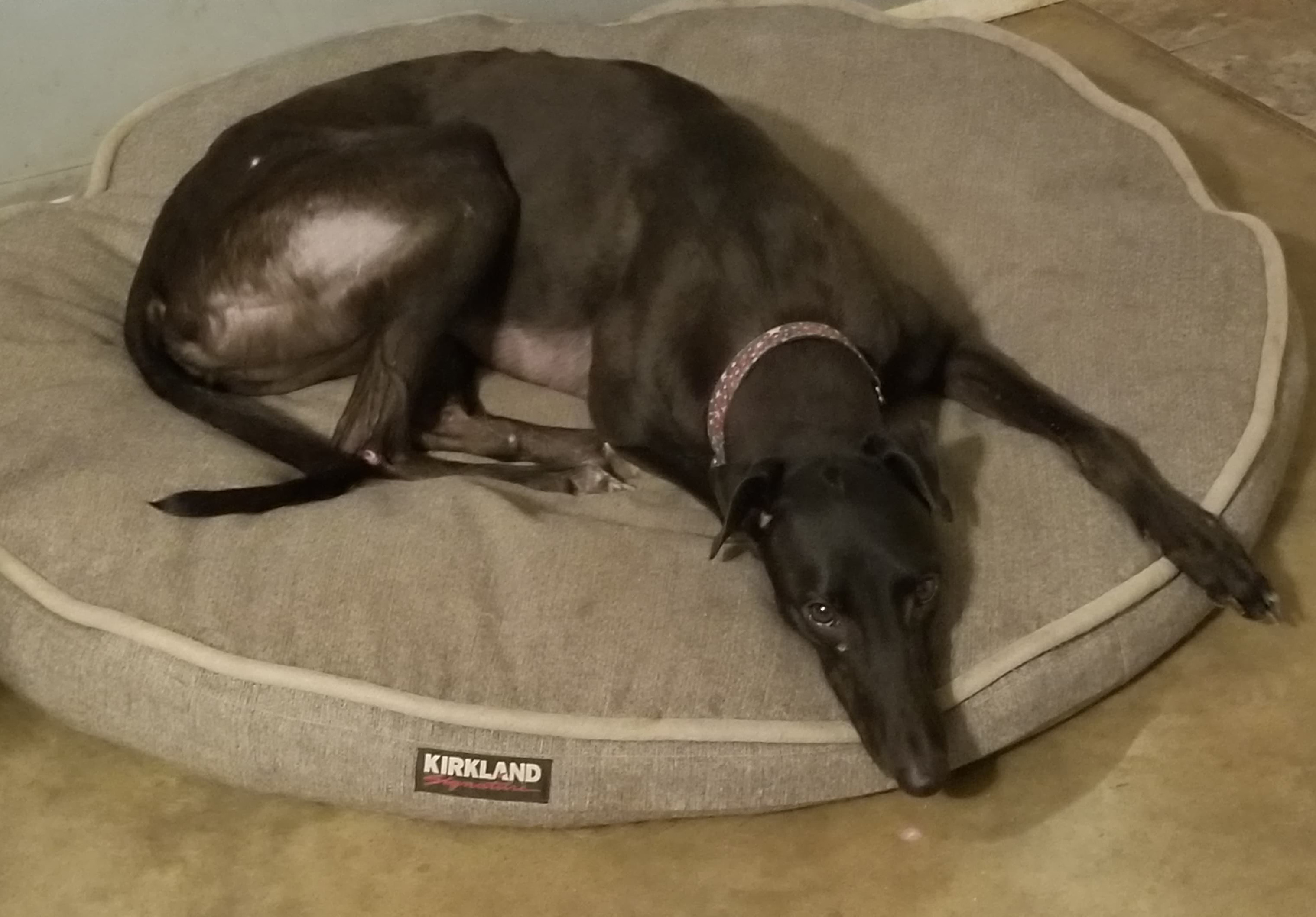 Mo came in from the Orange Park Race Track in Jacksonville FL. She only raced 5 maiden races there for dogs that have never won a race. She didn't win any of them and came in toward the back of the pack every time so was retired young. Mo is a tiny black female that raced at just 52lbs. She just turned 2 on July 1st. Her sire is the famous Gable Oscar and her dam is Gogo Ontario. Mo is very happy and friendly and still very puppy like. She loves to play and is great with kids. More as we get to know her.