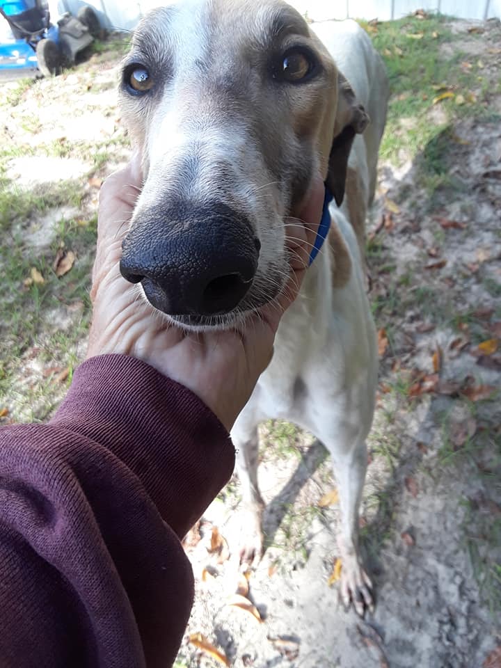 Roman is coming in from the Orange Park Race Track in Jacksonville FL. He raced 19 maiden races there for dogs that haven't won a race. He mainly finished in the back of the pack, placing in only a few races. So he was retired young and won't turn 2 until December 29th. His sire is Crossfire Clyde and his dam is Shana Wookie. Roman is a white boy with red spots that raced at 78lbs. He is a pretty tall guy that is described as being calm and friendly. He passed his cat test at the track so should be fine to live with cats or small dogs. He has gotten along with all the dogs in his foster home. He has a funny cowlick that runs down his neck that makes his hair stand straight up in a little stripe down the center of this neck, similar to a ridgeback. But his is just on his neck.