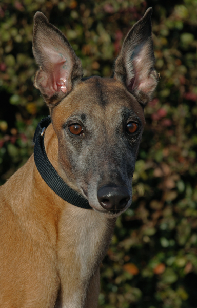Kevin came in from the Brindle Kennel at the Mardi Gras Race Track. He has 41 races listed and won a few of those getting up to B level. He actually competed in a Stakes race in Palm Beach. He was mostly competitive at the lower levels though. Kevin raced at 73lbs and just turned 3 on December 15th. His sire is the famous KC and All and his dam is K's Babe. Kevin was a bit overwhelmed when he arrived. He isn't shy and will wag his tail and go straight up to people. He just seemed a bit unsure with everything new going on around him. Kevin made a little noise in his kennel at first but quieted right down. He is a pretty fawn boy with a dark face and ears. His ears stand straight up when he is curious about something. Kevin passed his small dog test and is in a foster home with a small dog. He was too interested in chasing the cat to live with cats though.