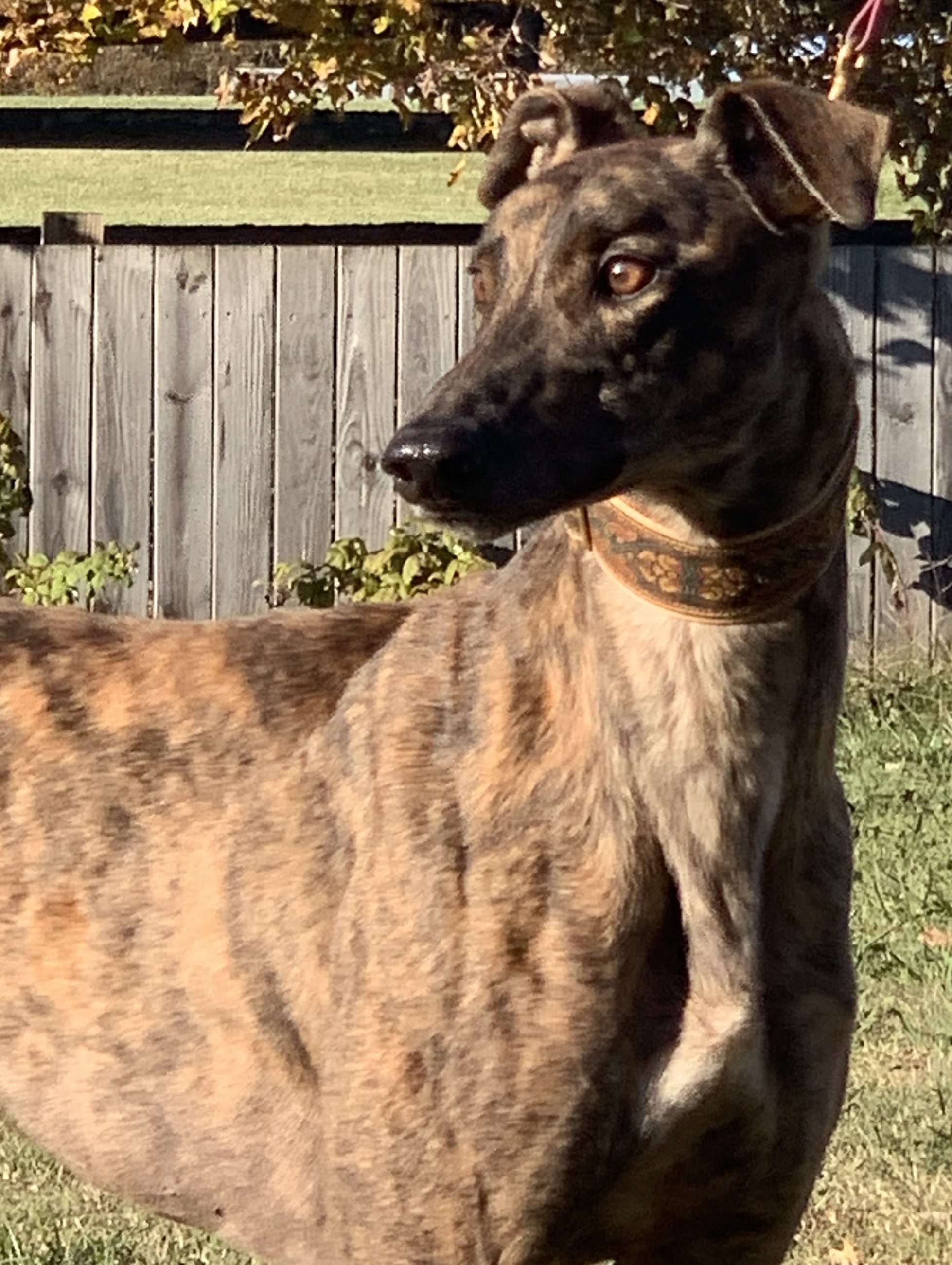 Klieman just arrived from the Code Red Racing Kennel at the Wheeling WV Race Track. He also raced at Palm Beach in Florida until all the tracks there closed. Klieman raced 72 races and was a grade A racer at Palm Beach. After moving to Wheeling he quickly dropped down to the lowest D level and was retired. Klieman is a handsome, dark mahogany, red brindle boy. His pictures don't capture how dark and pretty his color is. He raced at 82lbs so is an extra large guy. He is a very tall thin guy with extra long legs. Klieman seemed a little overwhelmed at first. He is a little reserved with people he doesn't know but just at first. Once he gets to know you he will talk to you and give you kisses. He doesn't pull when walking on leash. He seems pretty humble and unsure of himself, not a confident, pushy guy at all. Klieman was afraid of the cat when he met it and didn't want to go anywhere near it. After he got more comfortable in his foster home, he started chasing cats, so needs a home with no kitties now. Klieman passed his small dog tests. He seems like a gentle giant of guy. Klieman turned 3 on May 26th. His sire is Super C Riddick and his dam is BS Pengo. He was vetted at Emerald City Vet Clinic on Oct 29th. Klieman picked up steps right away and is not worried about slick wood floors even if he slips. He is still very submissive and sweet. He is food motivated and if you have food he will quickly be your best friend. He is the rare greyhound that might bark at intruders. He saw a couple of donkeys in the field near his foster home and barked a warning about the strange looking critters. Klieman's foster mom says he visibly relaxes when other dogs are around so may do best in a home with at least one other dog.