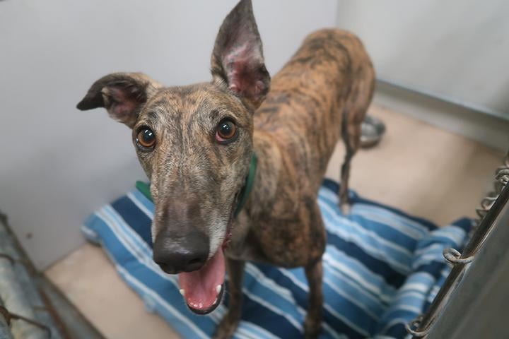 Linda just arrived from the Running To Stand Still farm in Florida. She raced 60 races at Derby Lane in Florida that just closed in December of 2020. Her last race was December 26th. She raced mainly at C and B levels. She is indeed a little girl and raced at just 56lbs. Linda will turn 3 on July 18th. Her sire is the famous SH Avatar and her dam is Kiowa Grand Girl. Although she passed her initial cat test when she arrived, her previous owner says she is very high prey drive and couldn't be around small dogs or cats at the kennel. She really feels like she needs a home with no small animals. More as we get to know her.