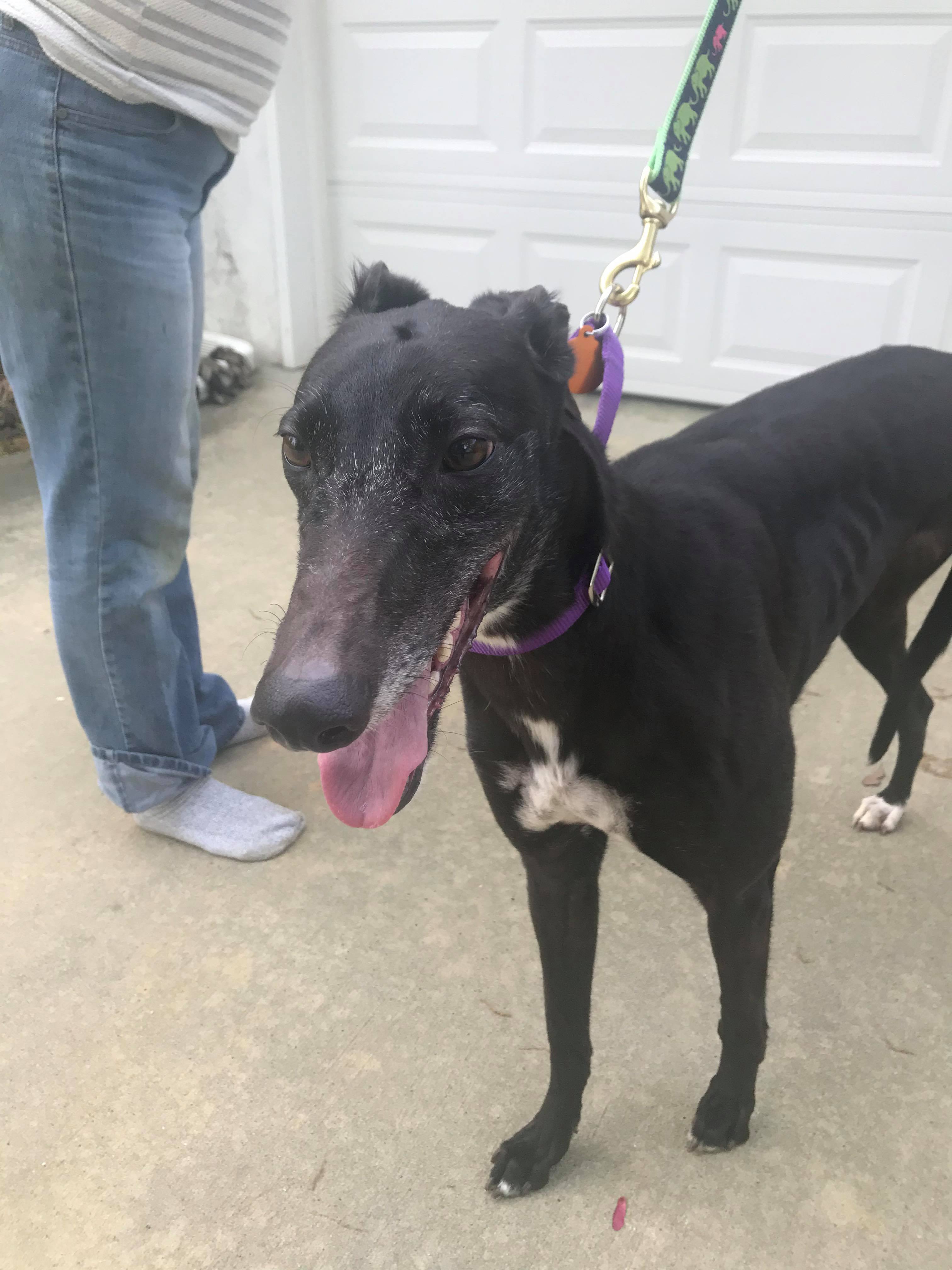 Betty came in from the Daytona Beach Race Track closing. She also raced briefly at Sarasota. She is a littermate to the famous Duxbury that won a couple of big Stakes races breaking record times for those races. She didn't share her brother's racing skill though. Betty mainly was competitive at the lower C and D levels. She mainly placed and only won 9 of her 93 races. Betty is a pretty black female that raced at 65lbs. She just turned 3 years old on March 12th. Her sire is the famous Pat C Clement and her dam is WW Lonesome Dove. Betty is a friendly girl. She passed her cat test easily and even was even fine with a chinchilla so has an exceptionally low prey drive. Betty walks great on leash. She has cute floppy ears one that usually flips forward and one that flips to the back. She has had a bit of a bad hair day recently and the vet had to shave a patch on her back due to a wound, but it will grow back. Betty is a calm girl that should be an easy addition to just about any family.