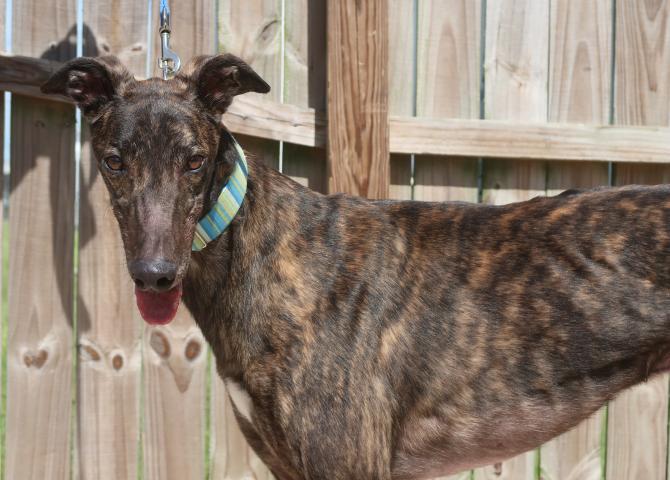 Special Needs Heart Problems! Bones came in from the Daytona Beach Track Closing. He raced at the Waverider Kennel there. He raced 94 races there, and did race a couple at Orange Park early on too. He wasn't real good and only won a few at the lower levels of racing. He just turned 3 on Feb 1st and raced at 73lbs. His sire is the famous Barcelona Boss and his dam is B's Elite Wendy. Bones passed his initial cat test with some sniffing and then lost interest but was too interested in cats when meeting them later so at this point he probably would do better in a home with no cats. He is a friendly guy that has a wonderful personality. Bones seems smart and picks up things fast. When he came in he excitedly pulled on leash checking everything out. After just a little coaching he started walking nicely on leash. Although Bones was used to being around and handled by the 5 kids of his trainer at the track, he did not like the kids in his first home so is back looking for a home with no kids. When Bones arrived our vets noticed that he had a significant heart murmur, enlarged heart and an irregular heart beat. He has been seen by a specialist at Upstate Specialists and does have what looks like genetic heart problems that are likely to continue to get worse and shorten his life. It is amazing that he was able to race and that his heart held up to that strenuous activity. We are starting him on a medication that will slow his progression into Congestive Heart Failure. Once he gets into Congestive heart failure he will have 8 to 10 months. We do not know how long he will have with the medication. Bones is just the sweetest guy and loves adults. He is still goofy, playful and fun and everyone that has met him has fallen in love with him. Our vet suggested limiting playtime to 10 minutes and no lure chasing or really strenuous play. Bones is a special guy that deserves a very special home for whatever time he has left. NOTE! Because of his status as Special Needs, interested adopters do not have to be on the waiting list and his adoption fee is reduced to help his new family.