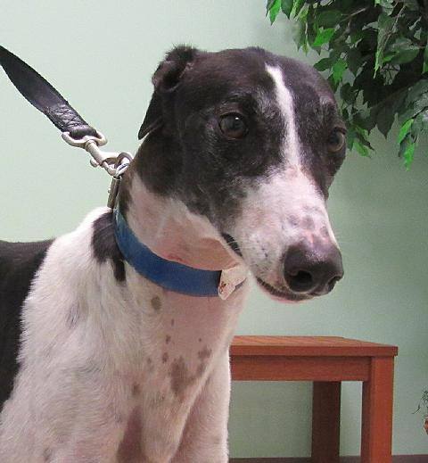 Hookah is a 61lb white female with black spots. She just arrived from Goodman Kennel at Sanford Orlando Race Track. She was a successful racer with a very long career of 211 races. She started out at Derby Lane in Florida and raced most of her races there. She moved to Sanford Orlando in June of 2016 and retired quickly. Hookah seems like a sweet friendly girl. Her sire is the famous DJays Octane and her dam is UCME Rushin By. Hookah passed her cat and small dog tests easily and was actually afraid of the cat. More as we get to know her.