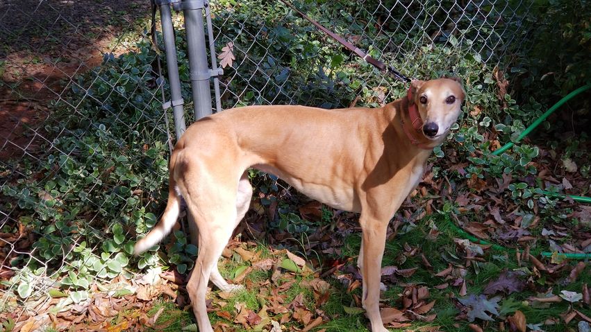 Cinnamon just arrived from the Roban Farm in FL. She is a littermate to Precious Gift that arrived at the same time. Cinnamon raced 76 races at Orange Park, Flagler and Naples Ft Myers in Florida. She retired from Naples on April 22nd 2017. She wasn't a very good racer, racing most of her career at the lower D Level. Some of her littermates were superstars at the track, so when Cinnamon retired from racing, she went back to the farm to be a mom. They didn't end up actually breeding her due to racing ending in Florida at the end of this year. So she has just been living at the farm for a few years and is being sent to us to find an adoptive home now. Cinnamon raced at 68lbs and turned 6 on March 3. Her sire is the famous Flying Coal City and her dam is Raiders Chia. More as we get to know her.