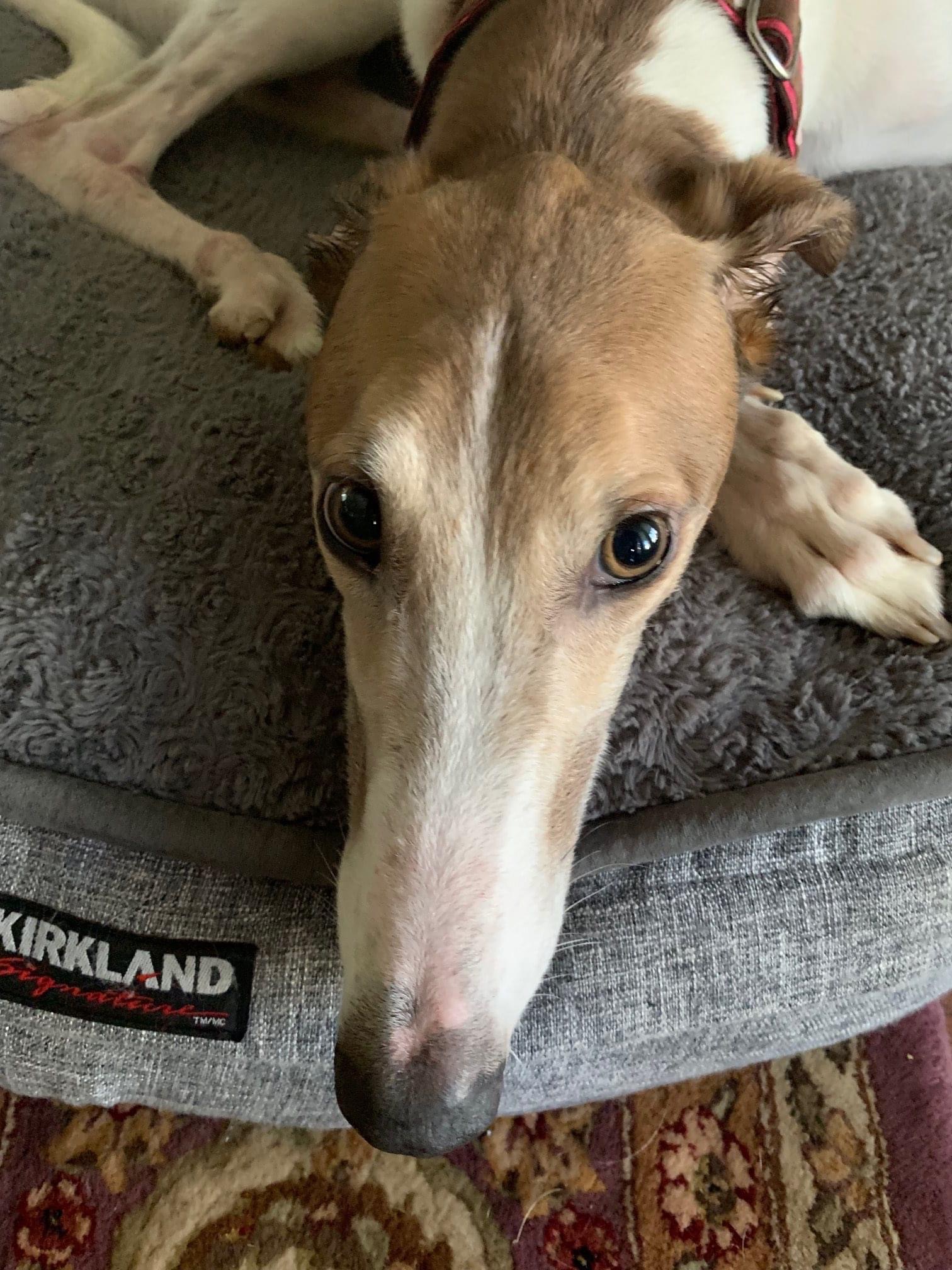 Tone just arrived with his littermate Echo. Their owner just passed away suddenly so we were asked to help rehome them. They are bonded so we are looking for a home where they can stay together. Tone was a better racer than his sister and went straight to the most competitive track in the country to race, Southland, in Arkansas. He raced 111 races there and quickly got up to A level Tone even raced in a couple Stakes race there. He raced at 75lbs and will turn 6 on December 8th. His sire is Talbon and his dam is Bakin. He raced his last race in October of 2018 and was adopted in January of 2019. He has been in his adoptive home up until now. Both dogs had a wonderful home where they were very loved and well taken care of. Tone has not been around cats, small dogs or kids in his previous home so he will need to be tested to see how he does with them. Tone is the more confident and outgoing of the two. His sister, Echo is very shy and timid with new people and in new environments at first.