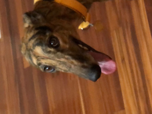 Mina initially came in from the Orange Park Race Track in Jacksonville Florida where she raced until July of 2020. She also raced some of her 30 races at Sanford Orlando race track and Palm Beach. got up to the top A level in Orlando but dropped down fast in her last few races. Mina is a tiny brindle girl that raced at just 56lbs. Her sire is Turbo Penske and her dam is Flying Snowstorm. She turned 3 on November 12th. She still needs to be tested with cats and small dogs. She was placed in a home with two older gentlemen in August of last year, but mostly avoids them and has growled and snapped at one of them. Mina usually chose to stay at the other end of the house when they were home, but loves it when strangers come over and will run right up to anyone new for attention. She was very loving with her foster family, so we think she was just in the wrong home. Mina loves to be around other greyhounds, she has no accidents in the house and is very well mannered in the house. She also walks beautifully on leash. Since she was grumpy towards one of her previous owners we would prefer to place her in a home with no kids. Mina is doing great in her foster home since we got her back. So well that they have decided to keep her permanently.