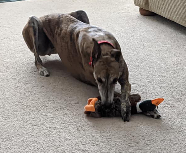 Tybee raced 41 races at Orange Park in Florida. She raced her last race back in June of 2018 and was placed in an adoptive home by Greyhounds as Pets of N. E Florida. She has been living in an adoptive home since then but her owners are relinquishing her to us for rehoming. She was living in Atlantic Beach NC. Tybee just turned 4 on March 4th. Her sire is Golden Squire and her dam is WW Kay Sun. She is a big girl that raced at 71lbs. Her previous owners say she is not good with cats and she hasn't been around kids but they don't think she would be good with small kids. Tybee is friendly and great with people, but does have a stubborn side according to her previous owners. More as we get to know her.