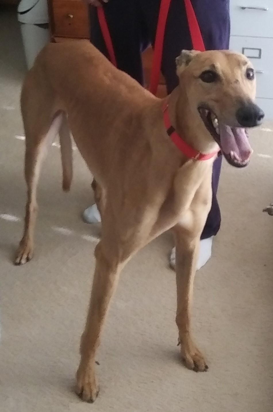 Spice just arrived from the Birmingham Race Course Adoption Kennel. He never actually raced there though. He raced most of his 114 races at the Caliente Track in Mexico. He was a good racer getting up to A level and winning there so he was moved to Southland in Arkansas to compete. He didn't do as well there and quickly dropped down to the lowest level and was retired. His last race was March 11th. He was sent to Birmingham to be placed in their excellent adoption program that sends dogs out to adoption groups all over the country. Spice's sire is the famous KC and All and his dam is WW's Vibrant. Spice if a very friendly guy that loves people. He is a big red male that raced at 77lbs. Spice will turn 4 on September 23rd. He was too interested in the cat to be able to live with kitties. He was fine with the small dog he met though. He seemed to like the kids he met too. Spice does pull when on leash so will need some more training to walk without pulling because he is a big strong guy. He is a happy guy that is curious about things and just wants to check everything out and he wants to go meet the people he sees.