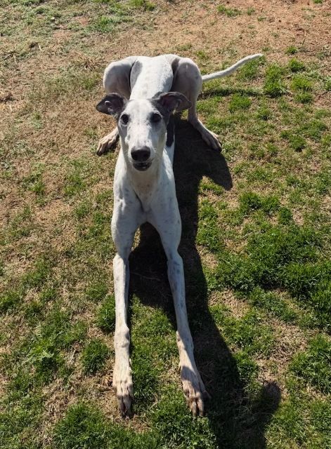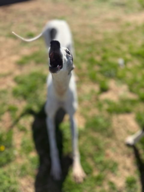 Toast just arrived from Tri State Race Track in WV, where he raced 83 races. He was a good racer getting up to the top AA level, winning 11 races and placing in a lot more. Toast is a mid sized male, racing at 73lbs. His DOB is 8/31/22, so he won't turn 4 until the end of July. Toast's sire is the famous Highly Classified and his dam is ABS Almighty. He has mixed reactions with cats so needs a home without them. Toast was good with the small dog he met. He is an extremely confident guy, that loves people and wanted to help drive on the trip to SC. He can be a bit pushy about getting what he wants. He seems like a natural leader of the pack type guy. Other than being a bit bossy,Toast has done fine with the other dogs in his foster home. He did stress when being left completely alone at first, but has improved has done OK as an only dog in his current foster home. Toast liked the kids he met, but he does like to give hugs, so could easily knock over a small child. We think he needs a home with older kids only. He is doing great in his foster home. He reacts with curiosity to everything and is fearful of nothing so far. Toast is a lot of happy dog that is going to be the life of the party. His favorite thing other than being with his people, is playing with toys. |