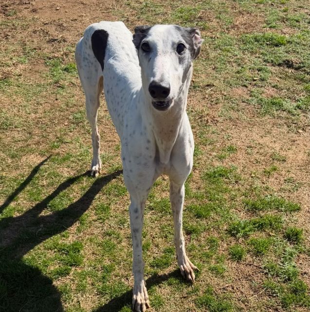 Mystery is an affectionate white girl with black spots that was initially adopted through another group which has now gone out of business. She has been in an adoptive home for years, so is already home acclimated. Mystery never raced but does have tattoos. She is a friendly girl that does the big greyhound grin that is a submissive, happy gesture. So cute! Mystery needs a home without cats. Although she initially tested safe with small dogs, over time, as she got more comfortable she decided she didn't like the small dog in her first foster home. Mystery is a confident girl that can be bossy with other dogs in her home. She is doing very well in a foster home with one other submissive greyhound but didn't do well in a home with a number of other dogs. She would be perfect for a home without any other dogs or just one other larger submissive dog. She would prefer not to have to share attention with a lot of other dogs. Mystery weighs around 63 lbs. She likes to play in very short spurts, but is mostly calm and enjoys her naps. She does complain a bit when separated from her humans, so she's probably not a good choice for apartment living. Mystery walks perfectly on leash, staying quietly by your side, so would be great for families who like to go for walks. What a great girl just looking for the perfect home! |