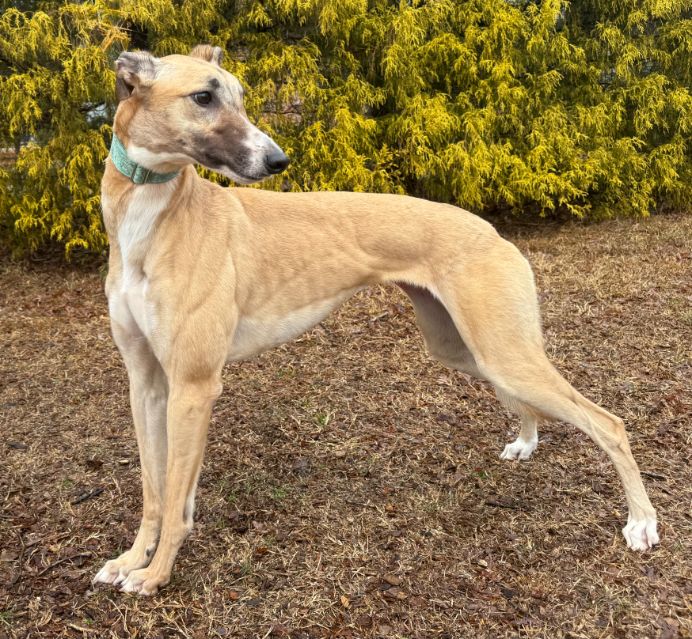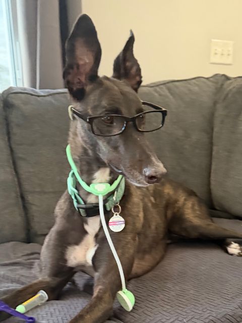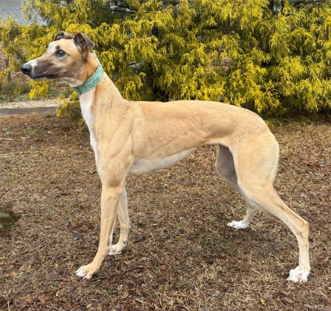 Toast just arrived from Tri State Race Track in WV, where he raced 83 races. He was a good racer getting up to the top AA level, winning 11 races and placing in a lot more. Toast is a mid sized male, racing at 73lbs. His DOB is 8/31/22, so he won't turn 4 until the end of July. Toast's sire is the famous Highly Classified and his dam is ABS Almighty. He was very interested in the cat at first, but after a slap from the cat, didn't even want to get near it or look at it again. We think he may be trainable and should be able to live with a confident cat, that would put him in his place. Toast was good with the small dog he met. He is an extremely confident guy, that loves people and wanted to help drive on the trip to SC. He can be pushy about getting what he wants. He was bossy with the other dogs on the trip down, and seems like a natural leader of the pack. Other than being a bit bossy,Toast has done fine with the other dogs in his foster home and seems to need another dog around. He did stress when being left completely alone. Toast liked the kids he met, but he does like to give hugs, so could easily knock over a small child. We think he needs a home with no small kids. He is doing great in his foster home and doesn't seem to be stressed, except when left alone. He reacts with curiosity to everything and is fearful of nothing so far. Toast is a lot of happy dog that is going to be the life of the party. His favorite thing other than love is playing with toys. |
