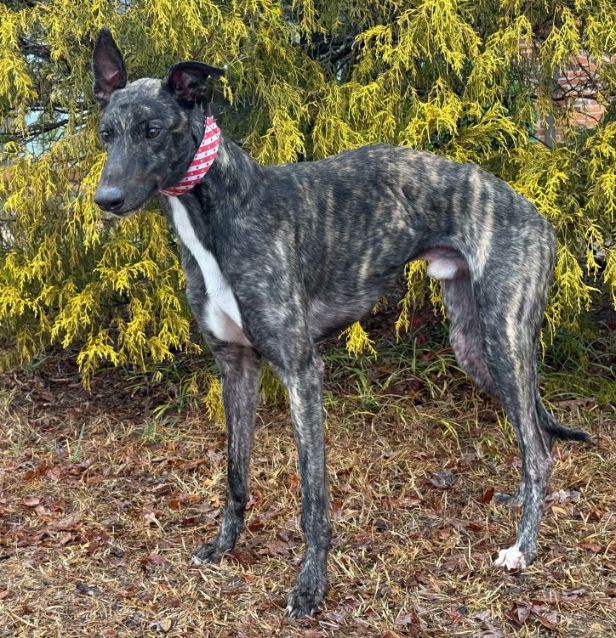 Marshall is arriving soon. He is an Australian guy that never raced. He was born on January 6th of 2024 so is just 2 years old. He is a beautiful dark almost brown and black brindle and is one of the tiniest males we have placed at only 57lbs. His foster family calls him Marshall because like a US Marshall he investigates everything. He is sweet and curious and likes older kids, other large dogs, being outside and running around. He doesn't like other dogs to bother him when eating. His foster home is working on that. Marshall also doesn't like sudden loud noises. Marshall should be small animal workable with close supervision. He is just very curious about everything he sees including cats and small dogs. More when we meet him. |