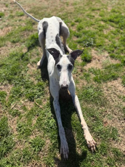 Mystery is a sweet, white girl with black spots that was initially adopted through another group that has now gone out of business. She has been in an adoptive home for years, so is already home acclimated. Mystery never raced but does have tattoos. She is a friendly girl that does the big greyhound grin that is a submissive, happy gesture. So cute! Although she initially tested safe with small dogs, over time she has shown both foster families in AL that her personality changes as she becomes comfortable. She's an alpha girl who will begin to guard her space with other dogs in her home and has confidence to test the limits with them. Because of this history, we feel she would not only be best but probably the most happy long-term as an only dog in her home. She could be the perfect match for a family with greyhound experience hoping to have only one slightly older dog. Mystery weighs around 63lbs and will be vetted as soon as she arrives. She likes to play in very short spurts, but is mostly calm and enjoys her naps. She is not a fan of crates and tends to panic if put in one. She does complain a bit when babygated, so she's probably not a good choice in apartments, if gating will be required. Her foster mom describes her as a extremely affectionate with her humans, choosing to spend time with them and following activities around the home. She's a snuggler on a bed or the couch too. She is great on leash and walks quietly by your side so would be great for families who leash walk daily. What a great girl just looking for the perfect home! |