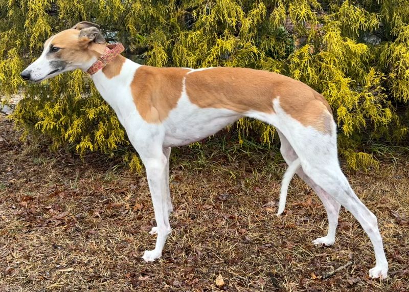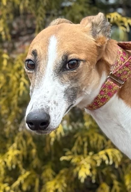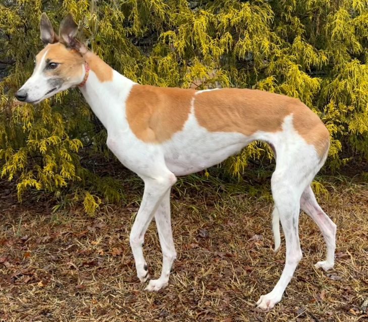 Candy just arrived from the Tri-State Race Track in WV where she raced 4 races. She raced the rest of her 22 races at the Wheeling WV race track. She only won 2 races and raced at the lower C and D levels. Her last race was August 22nd of 2024 and she has been back with her owner on the farm since then. Her sire is the famous DJays Octane and her dam is PJ Kool Aid. Candy will turn 4 on July 6th. She is a smaller girl racing at 60lbs. Candy is a timid girl, that has been very overwhelmed by everything new. She seems to want affection, but can be very cautious at first with people she doesn't know and approaches carefully or stays at a distance. She likes her routine and learned which kennel was hers the first night. She is very quiet in her kennel and considers it her safe place. She chooses to stay in her kennel even with the door open. She seems to do best with other dogs around and is less nervous and braver with other dogs to follow. She showed no interest in chasing the cat or small dog she met, so could live with either. She approached kids and seemed to be cautiously friendly with them. Because she is shy, Candy would probably do best in a quiet home with quiet kids or no children. Candy is a sweet little girl that will need time and patience to adapt and build confidence with her new family. Dogs that are shy can take months to warm up. She is good with other dogs and seems to try to avoid any conflict. |