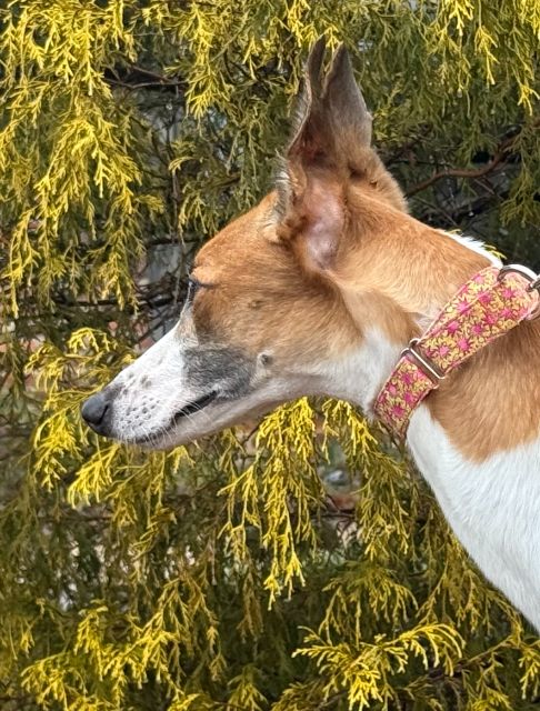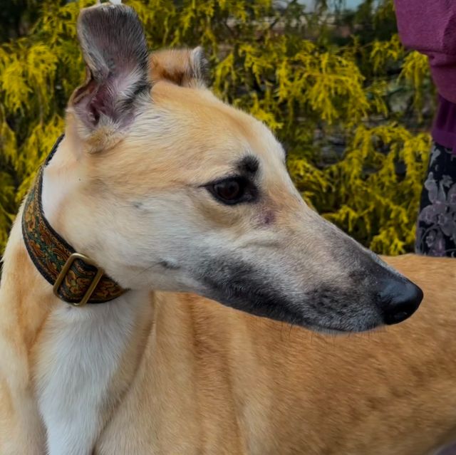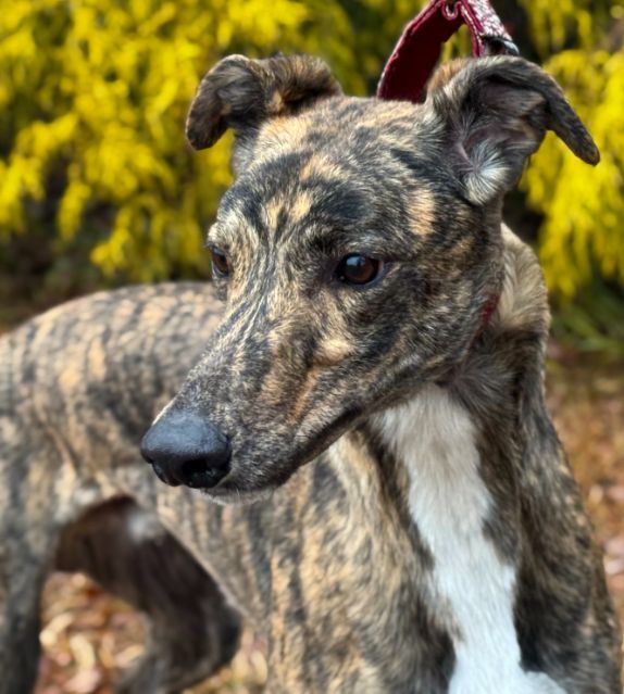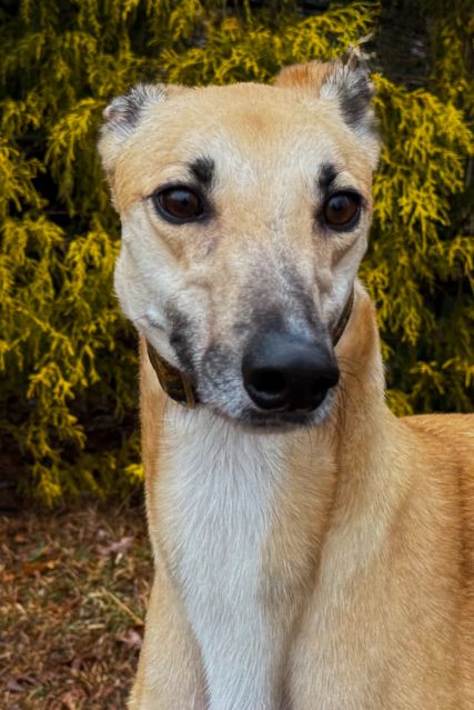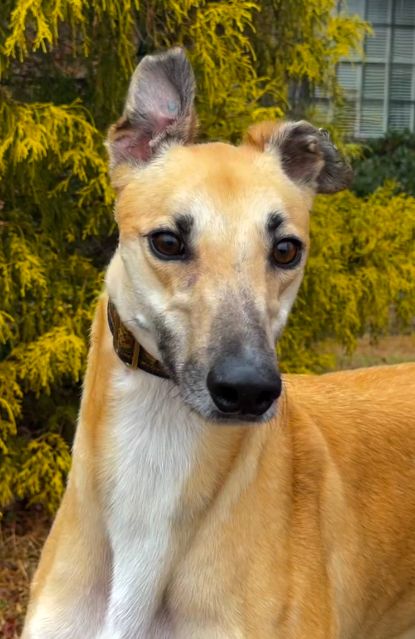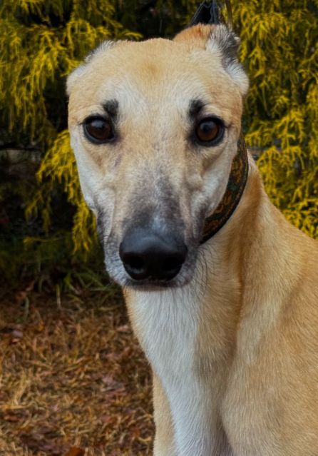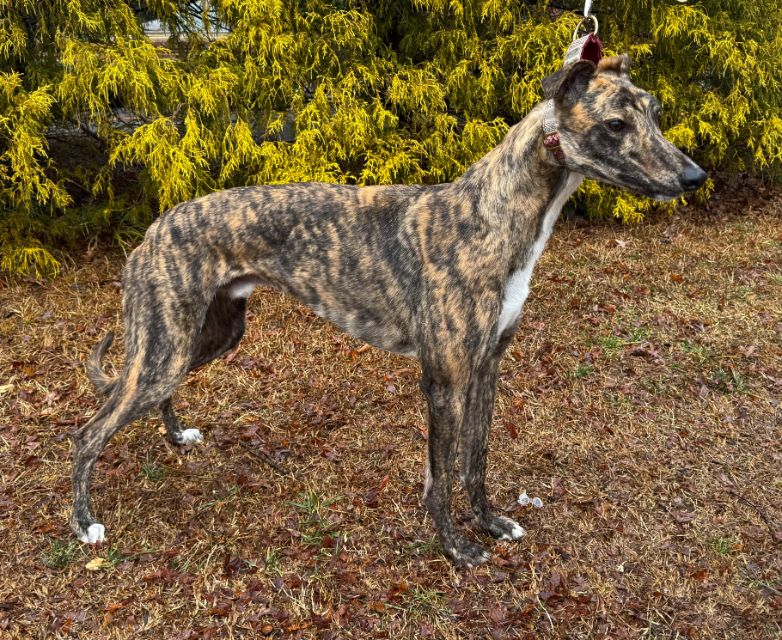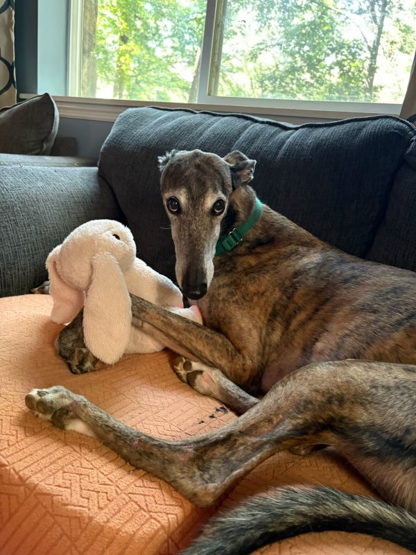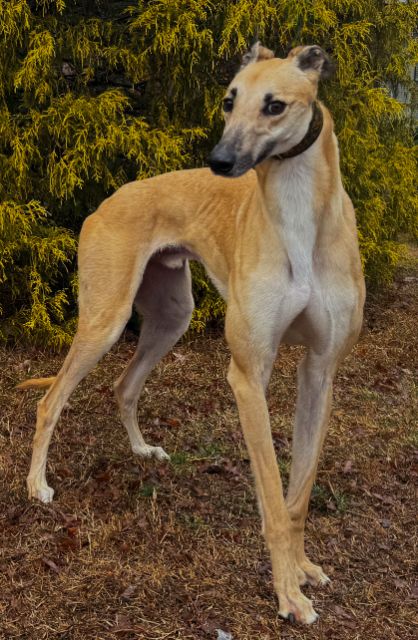 Hlos Intimidator is definitely not intimidating, and was actually called Jim at the farm. Jim never raced and came to us straight from the farm he was raised on in WV. He just wasn't interested enough in racing to ever make it to the race track. His Sire is RCK Goneinaflash and his dam is RCK Golden Grace. His sister Shear Volume arrived with him. Jim's date of birth is 4/12/24 so he will turn 2 in April. He is a very young guy that still has a bit of a puppy look to him. He never got an official racing weight but is around 75lbs. He is a very tall, narrow boy that is taller than most at that weight. His back touched the top of our large kennel. Jim is a sweet boy that seems to love people. He was a little overwhelmed by his first trip away from home, but seemed to handle everything remarkably well. He liked the kids he met. He was interested at first in the cat, but seemed mostly curious and appeared very trainable with some supervision at first. He was good with the small white dog he met so should be fine to live with small dogs too. Jim seems curious about his surroundings so we think he is likely to gain confidence fast. He seemed pretty calm for a pup and got along well with the other greyhounds. He hasn't been pushy or demanding but does love attention. |