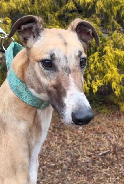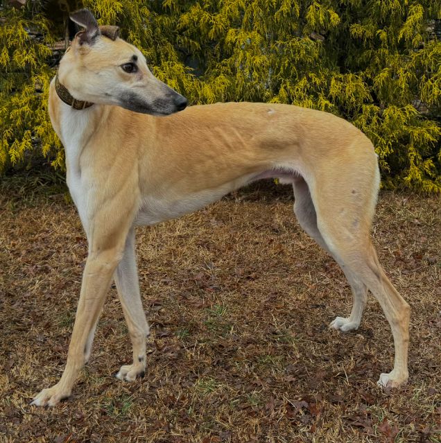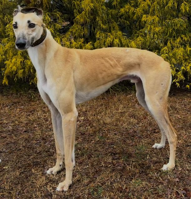 Toast just arrived from Tri State Race Track in WV, where he raced 83 races. He was a good racer getting up to the top AA level, winning 11 races and placing in a lot more. Toast is a mid sized male, racing at 73lbs. His DOB is 8/31/22, so he won't turn 4 until the end of July. Toast's sire is the famous Highly Classified and his dam is ABS Almighty. He was very interested in the cat at first, but after a slap from the cat, didn't even want to get near it or look at it again. We think he may be trainable and should be able to live with a confident cat, that would put him in his place. Toast was good with the small dog he met. He is an extremely confident guy, that loves people and wanted to help drive on the trip to SC. He can be pushy about getting what he wants. He was bossy with the other dogs on the trip down and seems like a natural leader of the pack. He liked the kids he met, but he does like to give hugs, so could easily knock over a small child. He is doing great in his foster home and doesn't seem to be stressed. He reacts with curiosity to everything and is fearful of nothing so far. Toast is a lot of happy dog. |