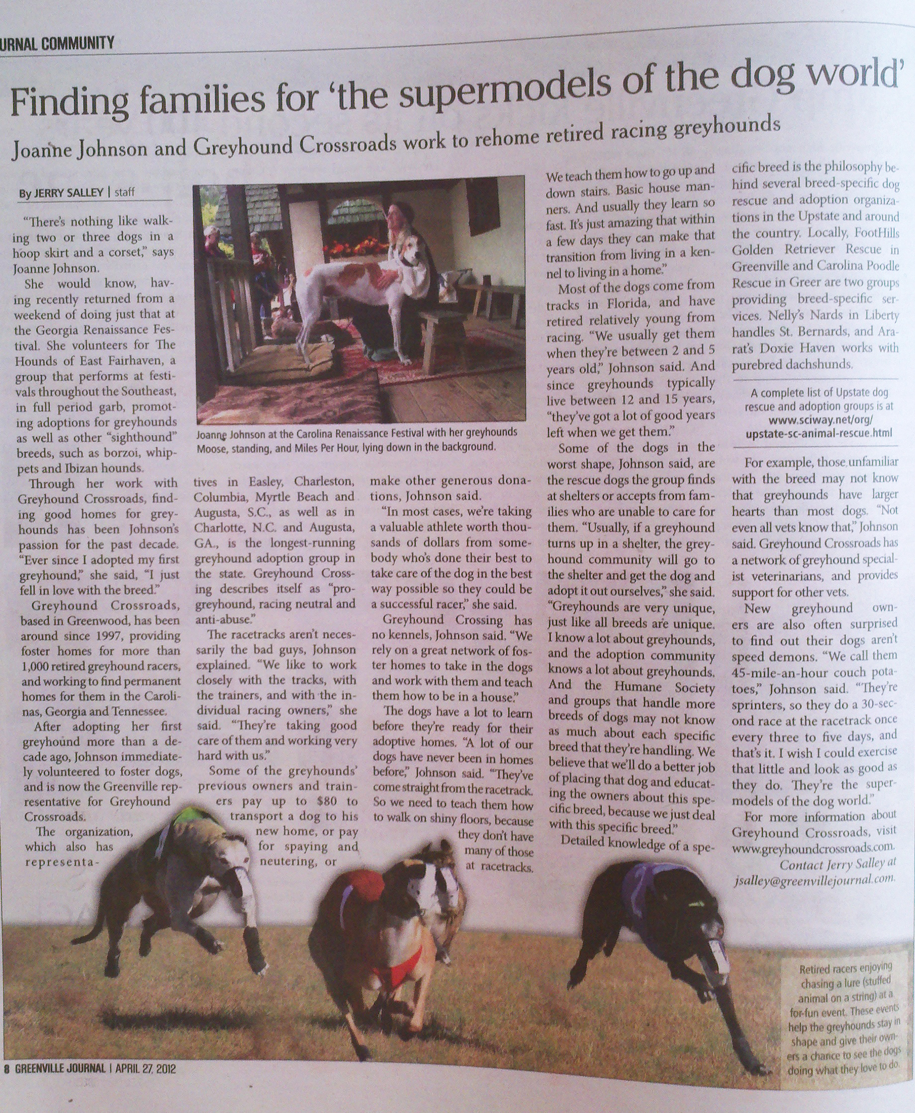 Article about Greyhound Crossroads in the Gaffney SC Ledger Click Here to Read